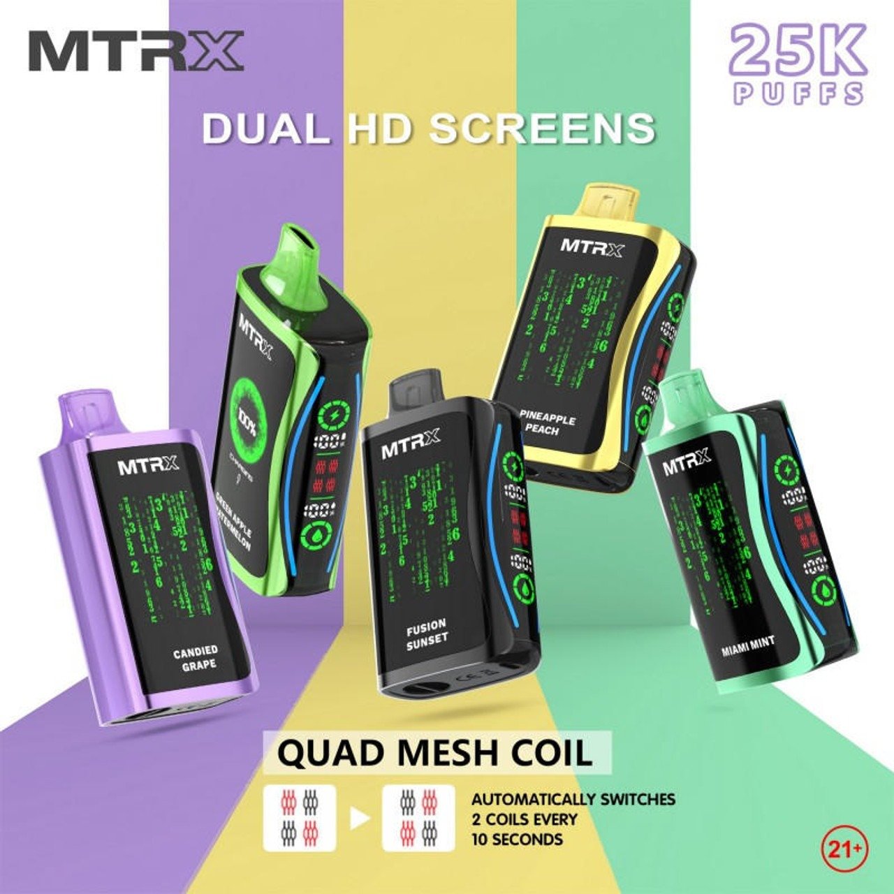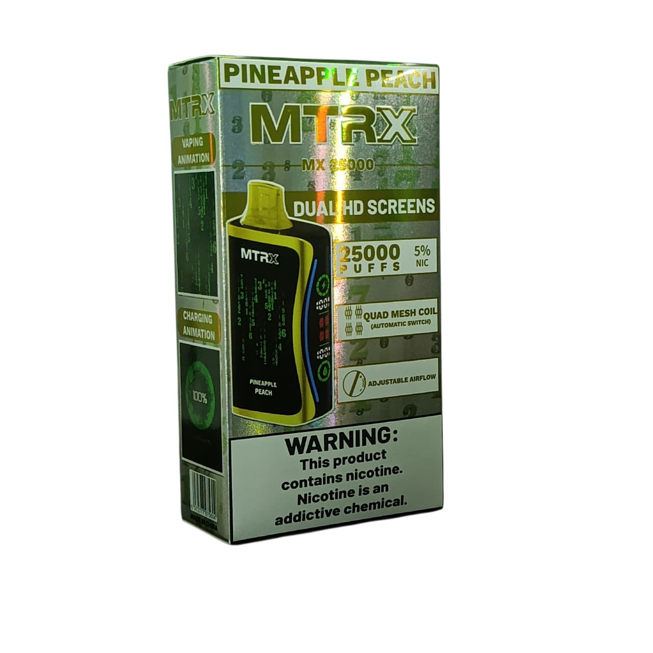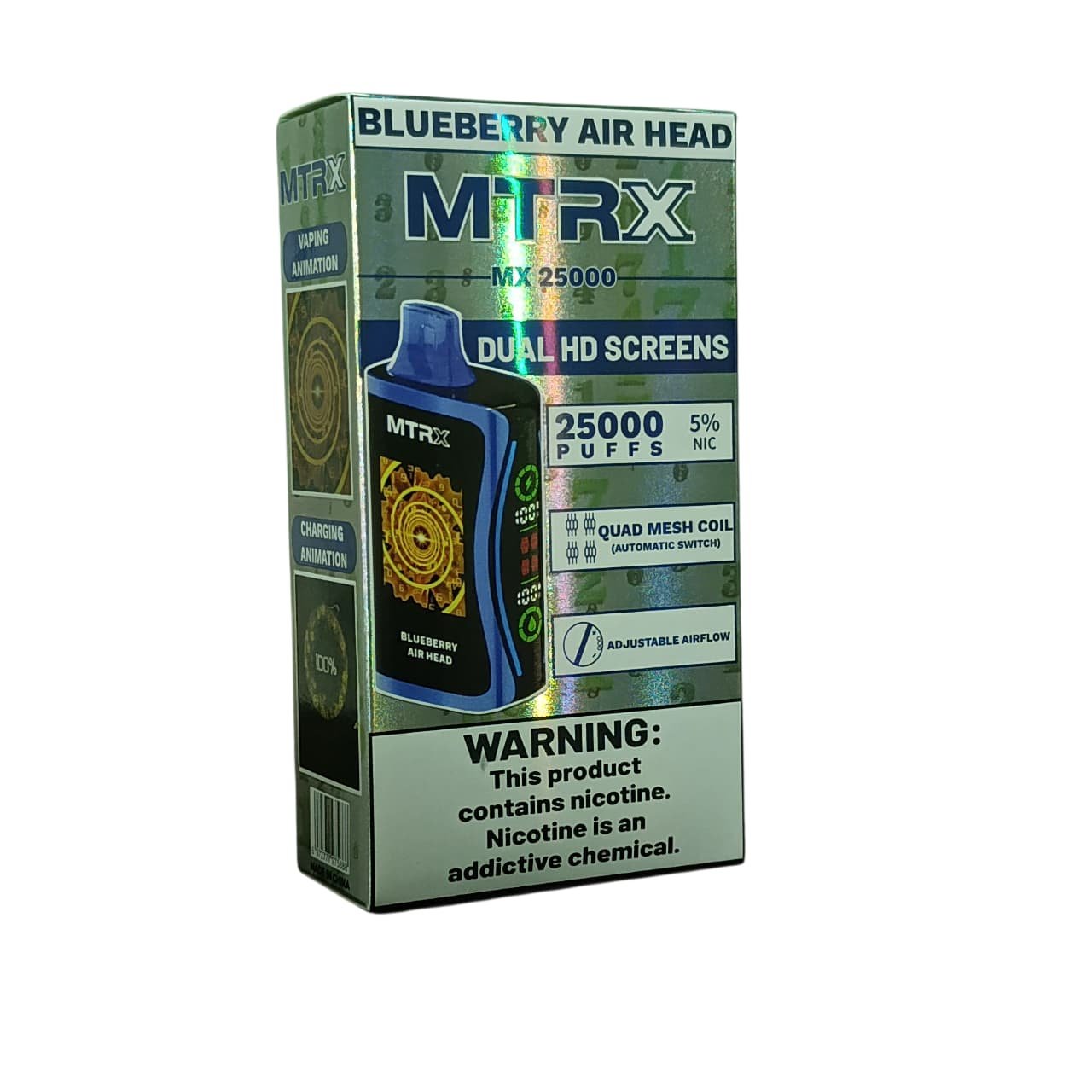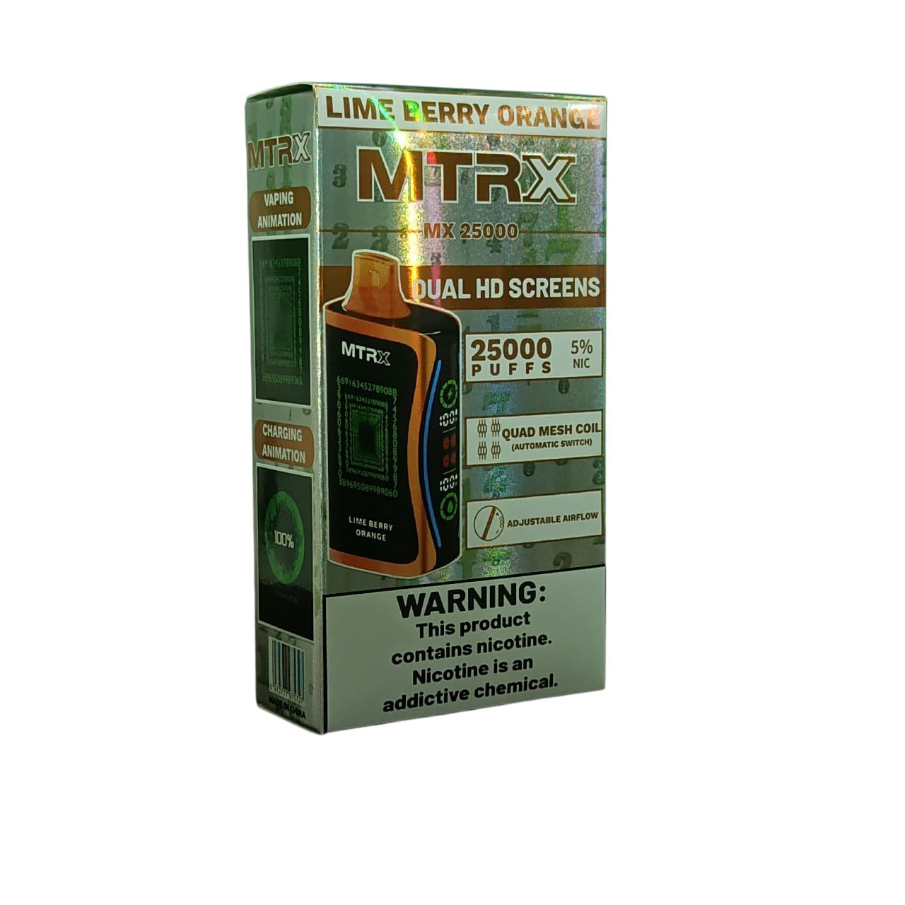 El MTRX MX 25000 es un dispositivo desechable de vapeo de alta capacidad diseñado para quienes buscan durabilidad, potencia y comodidad en un solo equipo. Con un diseño futurista y compacto, ofrece hasta 25 000 caladas aproximadas, convirtiéndose en uno de los vapes más resistentes y avanzados del mercado.